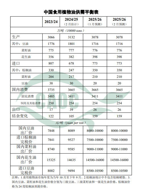 本月對中國食用植物油供需預測與上月保持一致。1月中旬后期,寒潮帶來大范圍低溫雨雪冰凍天氣,導致湖北、湖南、江西等地已抽薹油菜遭受輕微凍害,但總體影響有限。截至1月末,四川盆地大部、長江中下游地區(qū)、貴州等油菜產(chǎn)區(qū)處于現(xiàn)蕾至抽薹期,云南部分地區(qū)進入開花期。本月暫不對油菜籽及菜籽油產(chǎn)量進行調(diào)整。